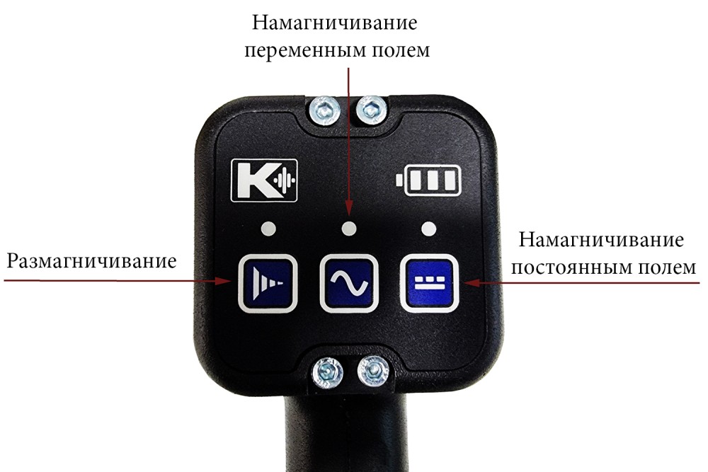 На клавиатуре выбирается способ намагничивания или режим размагничивание, перевод электромагнита в режим работы осуществляется кнопкой пуск расположенной на нижней части прибора под указательный палец, как курок.