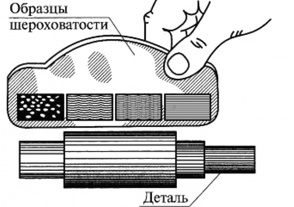 ПОРЯДОК РАБОТЫ: Контроль шероховатости поверхности детали производится путём сравнения с образцом визуально и на ощупь, проводя ногтем, выполняющим здесь роль “чувствительного элемента – датчика”, вдоль линии максимальной шероховатости поверхности. Как правило, эта линия перпендикулярна следам обработки (а расстояние между соседними следами характеризует параметр Sm). Для этого подбирается образец соответствующего вида обработки, номинальное числовое значение параметра шероховатости поверхности которого соответствует числовому значению параметра шероховатости поверхности контролируемой детали. В результате сравнения делается заключение о том, что параметр шероховатости контролируемой детали не превышает номинальное значение подобранного образца сравнения. Наиболее достоверно оцениваются детали из аналогичного образцу материала и изготовленные тем же, что и образец, способом обработки.