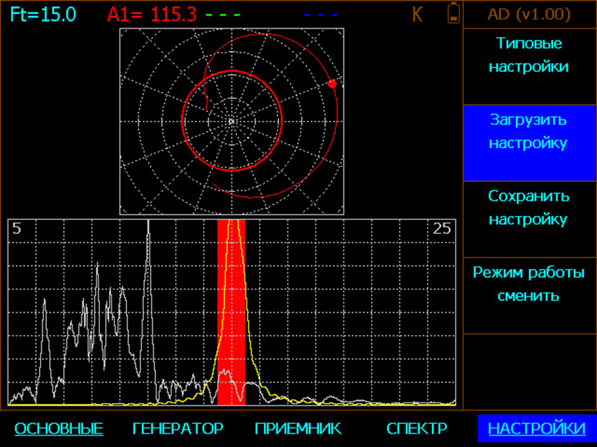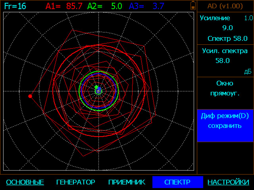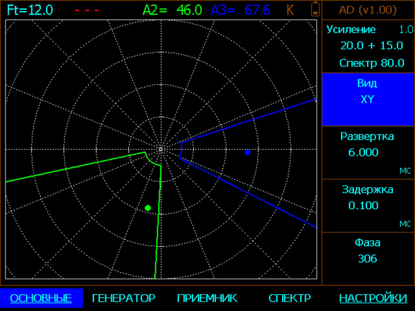 Одновременное отображении реального сигнала с преобразователя и его спектра с раздельным регулирование усиления во временной и спектральной области.