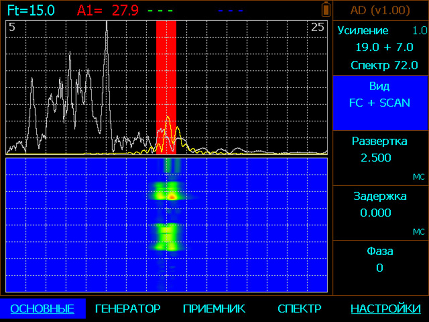 Цветовая развертка типа "водопад", позволяющая выделять цветом амплитуды сигналов, аналогично классическому С-скану для УЗК. Высокая информативность развертки позволяет суммировать данные о сигнале и находить дефекты там, где другие приборы не дают результата.