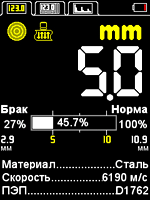 НОРМА – режим предназначен для определения толщины изделия с возможностью установки диапазона срабатывания АСД при отклонении от заданной номинальной толщины. При этом на дисплее индицируется показания остаточной толщины в миллиметрах и % от заданной нормы.
