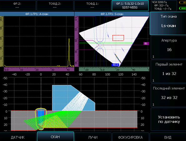 Высокая разрешающая способность и различные виды сканирования : классический S-Скан, сканирование по фиксированному углу (L-scan), комбинированное сканирование (качание луча и перемещение по апертуре) LS-скан (compaund S-scan)